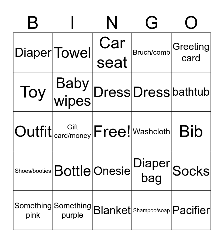 This bingo card has a free space and 25 words: Bottle, Blanket, Dress, Something pink, Greeting card, Diaper, Toy, Towel, Washcloth, Onesie, Dress, Outfit, Diaper bag, Socks, Baby wipes, Formula, Bib, Car seat, bathtub, Gift card/money, Pacifier, Something purple, Shoes/booties, Bruch/comb and Shampoo/soap.