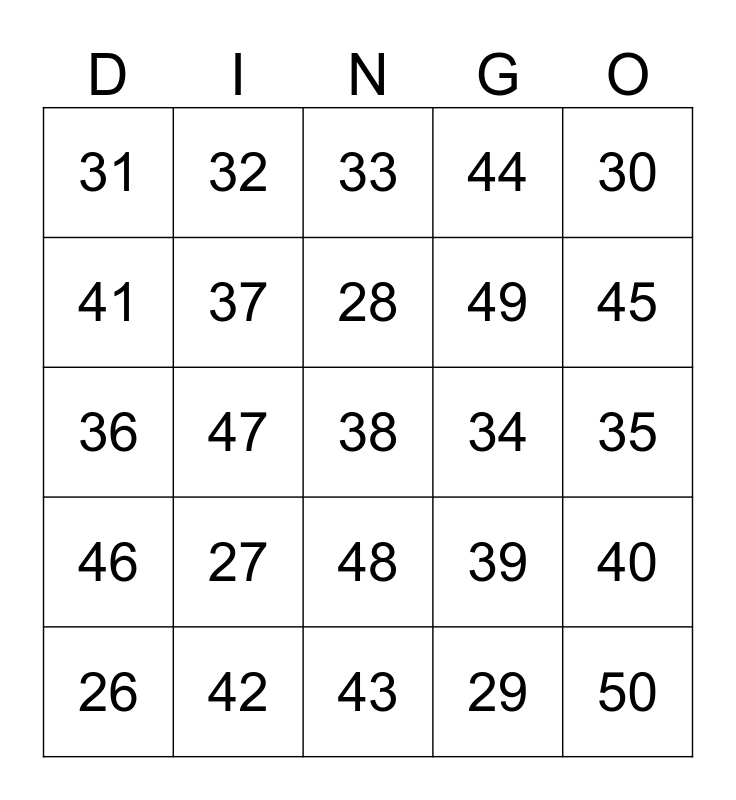 This bingo card has a free space and 24 words: 26, 27, 28, 29, 30, 31, 32, 33, 34, 35, 36, 37, 39, 40, 41, 42, 43, 44, 45, 46, 47, 48, 49 and 50.