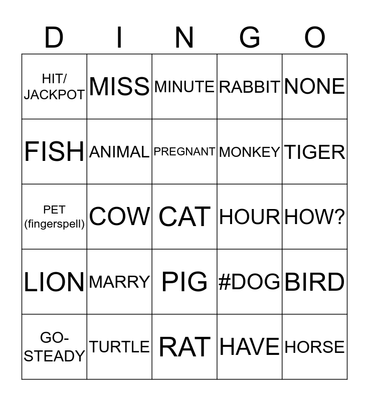 This bingo card has a free space and 24 words: GO-STEADY, MARRY, PREGNANT, HAVE, NONE, HIT/ JACKPOT, MISS, MINUTE, HOUR, HOW?, PET (fingerspell), ANIMAL, #DOG, BIRD, FISH, TURTLE, RAT, RABBIT, TIGER, LION, COW, PIG, MONKEY and HORSE.