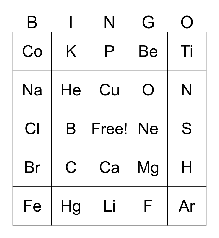 This bingo card has a free space and 24 words: C, Hg, Cu, Fe, Ti, Co, Na, K, Ne, Ca, O, Cl, Mg, H, He, F, S, P, N, B, Ar, Br, Be and Li.