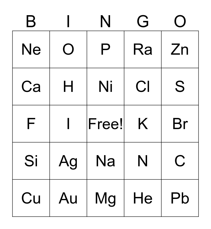 This bingo card has a free space and 24 words: Ag, Au, Ni, Cu, Zn, Ne, Ca, O, K, Na, Cl, F, N, C, H, He, Br, P, S, I, Pb, Si, Ra and Mg.