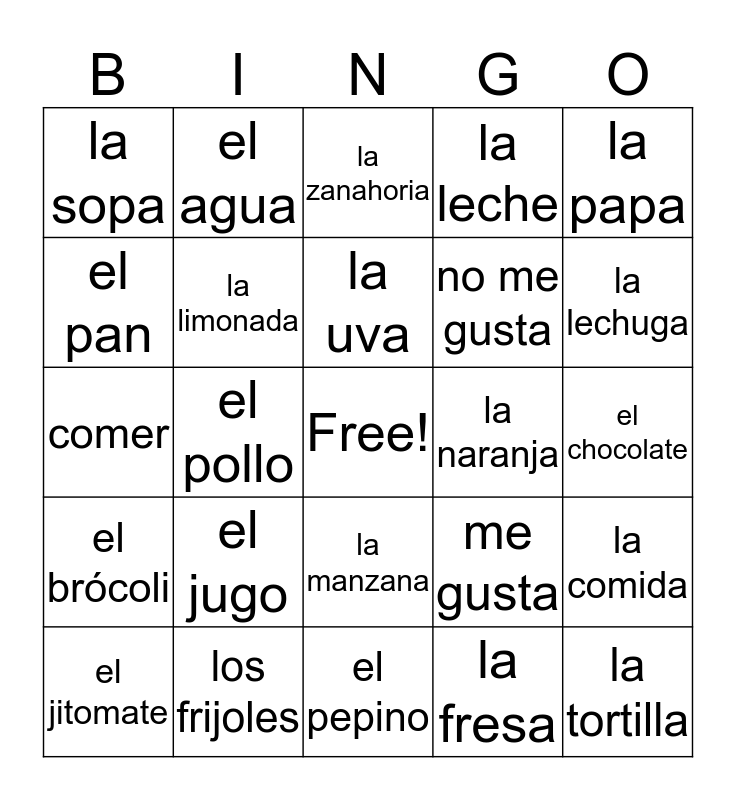 This bingo card has a free space and 26 words: la manzana, la fresa, la uva, los frijoles, la papa, la sopa, el pan, el agua, el chocolate, me gusta, no me gusta, comer, la comida, el jitomate, el pollo, el plátano, la leche, el brócoli, la zanahoria, la tortilla, la lechuga, el pepino, la naranja, el jugo, la limonada and la calabaza.