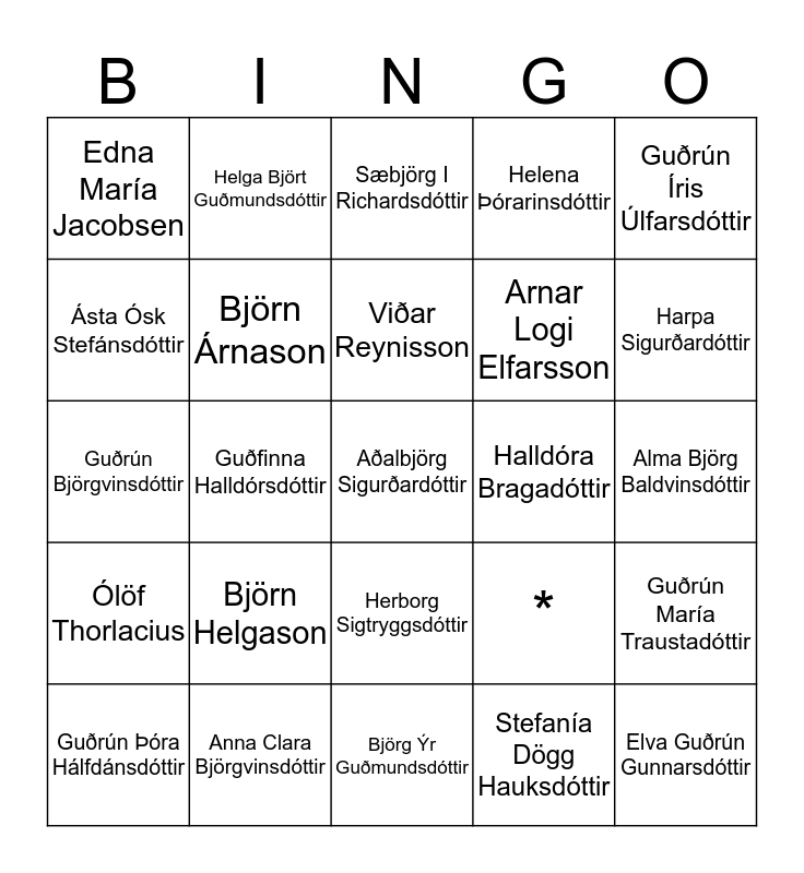 This bingo card has 25 words: Björn Helgason, Björg Ýr Guðmundsdóttir, Viðar Reynisson, Guðrún Þóra Hálfdánsdóttir, Guðrún Íris Úlfarsdóttir, Edna María Jacobsen, Ásta Ósk Stefánsdóttir, Helga Björt Guðmundsdóttir, Halldóra Bragadóttir, Herborg Sigtryggsdóttir, Arnar Logi Elfarsson, Guðrún Björgvinsdóttir, *, Guðrún María Traustadóttir, Björn Árnason, Elva Guðrún Gunnarsdóttir, Alma Björg Baldvinsdóttir, Sæbjörg I Richardsdóttir, Harpa Sigurðardóttir, Guðfinna Halldórsdóttir, Aðalbjörg Sigurðardóttir, Anna Clara Björgvinsdóttir, Ólöf Thorlacius, Helena Þórarinsdóttir and Stefanía Dögg Hauksdóttir.