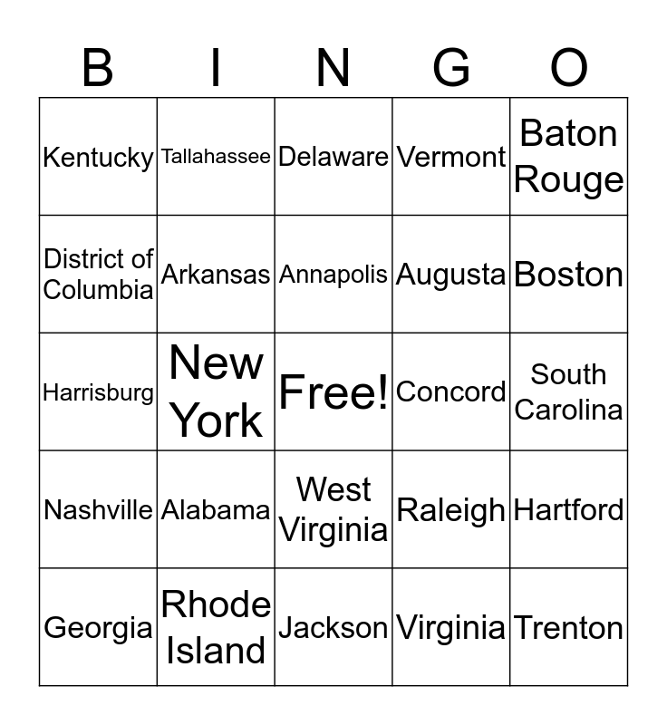 This bingo card has a free space and 24 words: Alabama, Rhode Island, Annapolis, Georgia, Baton Rouge, Kentucky, District of Columbia, Tallahassee, Concord, West Virginia, Augusta, Harrisburg, Raleigh, Hartford, Arkansas, Virginia, South Carolina, Delaware, Boston, New York, Trenton, Nashville, Vermont and Jackson.