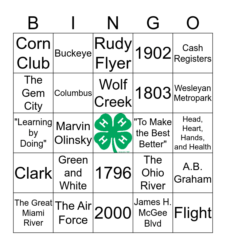 This bingo card has a free space and 24 words: Green and White, The Air Force, Wolf Creek, The Great Miami River, Cash Registers, Corn Club, The Gem City, Buckeye, "To Make the Best Better", 1796, 1803, "Learning by Doing", The Ohio River, A.B. Graham, Columbus, James H. McGee Blvd, Head, Heart, Hands, and Health, Rudy Flyer, Wesleyan Metropark, Marvin Olinsky, Flight, Clark, 1902 and 2000.
