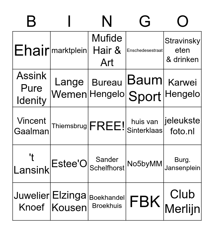 This bingo card has a free space and 24 words: Estee'O, Elzinga Kousen, Bureau Hengelo, Juwelier Knoef, Stravinsky eten & drinken, Ehair, Assink Pure Idenity, marktplein, huis van Sinterklaas, Sander Schelfhorst, Baum Sport, Vincent Gaalman, No5byMM, Burg. Jansenplein, Lange Wemen, FBK, jeleukste foto.nl, Mufide Hair & Art, Karwei Hengelo, Thiemsbrug, Club Merlijn, 't Lansink, Enschedesestraat and Boekhandel Broekhuis.