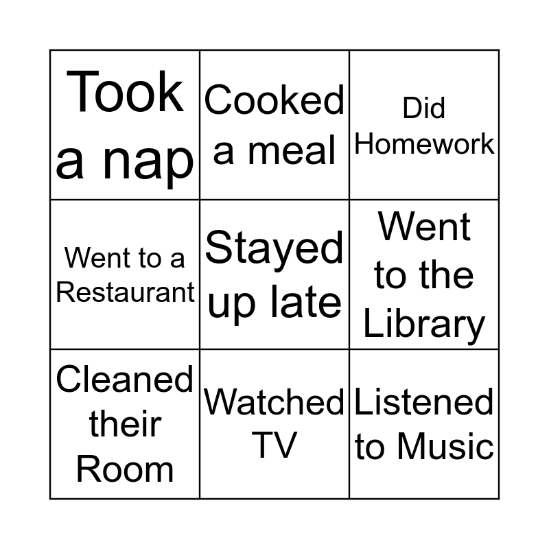 This bingo card has a free space and 8 words: Went to the Library, Did Homework, Cooked a meal, Cleaned their Room, Took a nap, Listened to Music, Went to a Restaurant and Watched TV.