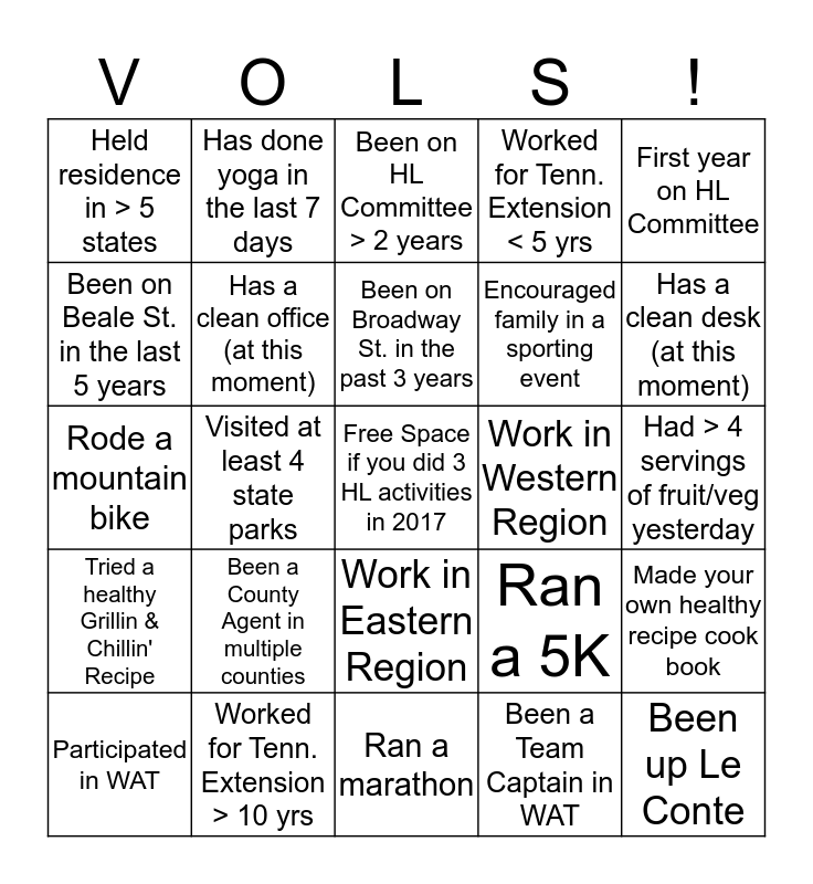 This bingo card has a free space and 44 words: Been to > 25 states, Been up Le Conte, Participated in Clean Desk Challenge, Participated in WAT, Participated in May Marathon Month, Been a Team Captain in WAT, Been on HL Committee > 2 years, Been on HL Committee > 3 years, First year on HL Committee, Worked for Tenn. Extension > 10 yrs, Worked for Tenn. Extension < 5 yrs, Work in Western Region, Work in Eastern Region, Been a County Agent in multiple counties, Work in Central Region, Ran a marathon, Jumped out of a perfectly good plane, Rode a mountain bike, Hiked on the Appalachian Trail, Has a clean desk (at this moment), Has done yoga in the last 7 days, Worked out this morning, Meditated in the last 5 days, Held residence in > 5 states, Born in Tennessee, Had > 4 servings of fruit/veg yesterday, Am a non-smoker, Ran a half marathon, Ran a 5K, Tried a healthy Grillin & Chillin' Recipe, Have shared a healthy recipe, Made your own healthy recipe cook book, Skipped desert last weekend, Have commuted to work via bicycle, Visited at least 4 state parks, Camped at least 2 state parks, Visited Graceland, Seen a show at the Ryman, Been on Broadway St. in the past 3 years, Been on Beale St. in the last 5 years, Encouraged family in a sporting event, Taught family a healthy cooking alternative, Has a clean office (at this moment) and Tried an active desk alternative.