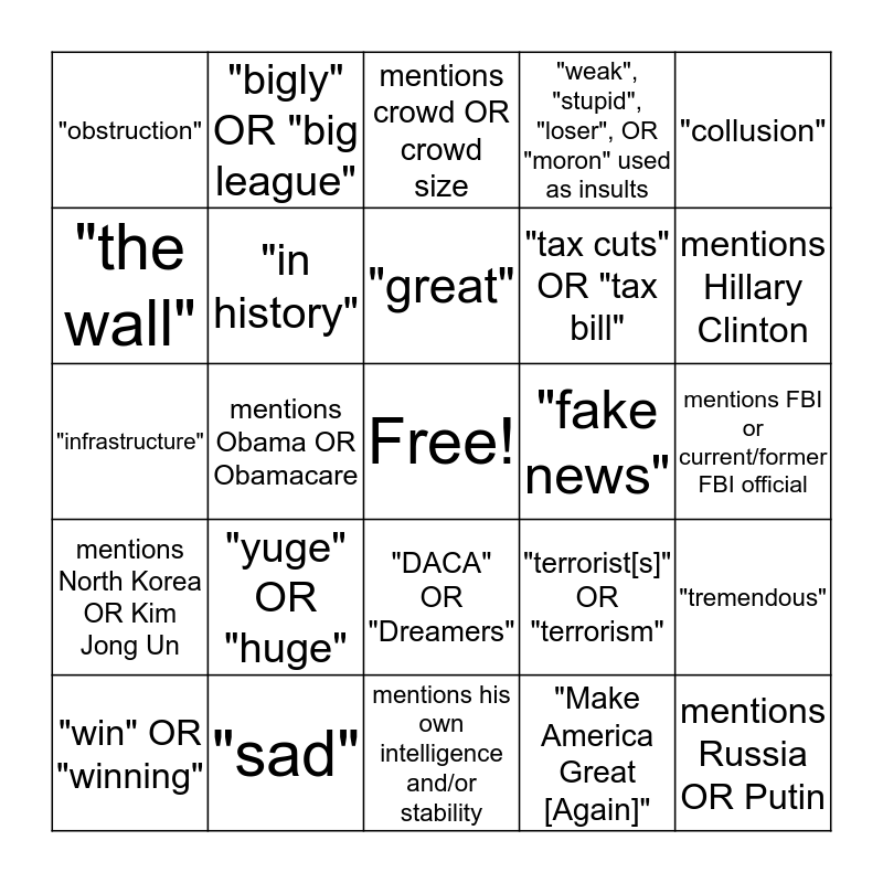 This bingo card has a free space and 24 words: "yuge" OR "huge", "sad", "great", "win" OR "winning", "collusion", "obstruction", "the wall", "bigly" OR "big league", "fake news", "DACA" OR "Dreamers", "tax cuts" OR "tax bill", "infrastructure", "terrorist[s]" OR "terrorism", "tremendous", "in history", "Make America Great [Again]", mentions FBI or current/former FBI official, mentions crowd OR crowd size, mentions Hillary Clinton, mentions Obama OR Obamacare, mentions Russia OR Putin, mentions North Korea OR Kim Jong Un, "weak", "stupid", "loser", OR "moron" used as insults and mentions his own intelligence and/or stability.