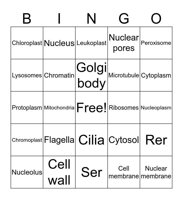 This bingo card has a free space and 24 words: Flagella, Cell wall, Golgi body, Nucleolus, Peroxisome, Chloroplast, Lysosomes, Nucleus, Ribosomes, Cilia, Microtubule, Protoplasm, Cytosol, Rer, Chromatin, Cell membrane, Nucleoplasm, Leukoplast, Cytoplasm, Mitochondria, Nuclear membrane, Chromoplast, Nuclear pores and Ser.