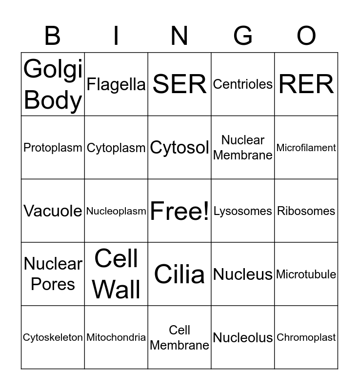 This bingo card has a free space and 24 words: Cell Wall, Mitochondria, Cytosol, Cytoskeleton, RER, Golgi Body, Protoplasm, Flagella, Lysosomes, Cilia, Nuclear Membrane, Vacuole, Nucleus, Microtubule, Cytoplasm, Nucleolus, Ribosomes, SER, Microfilament, Nucleoplasm, Chromoplast, Nuclear Pores, Centrioles and Cell Membrane.