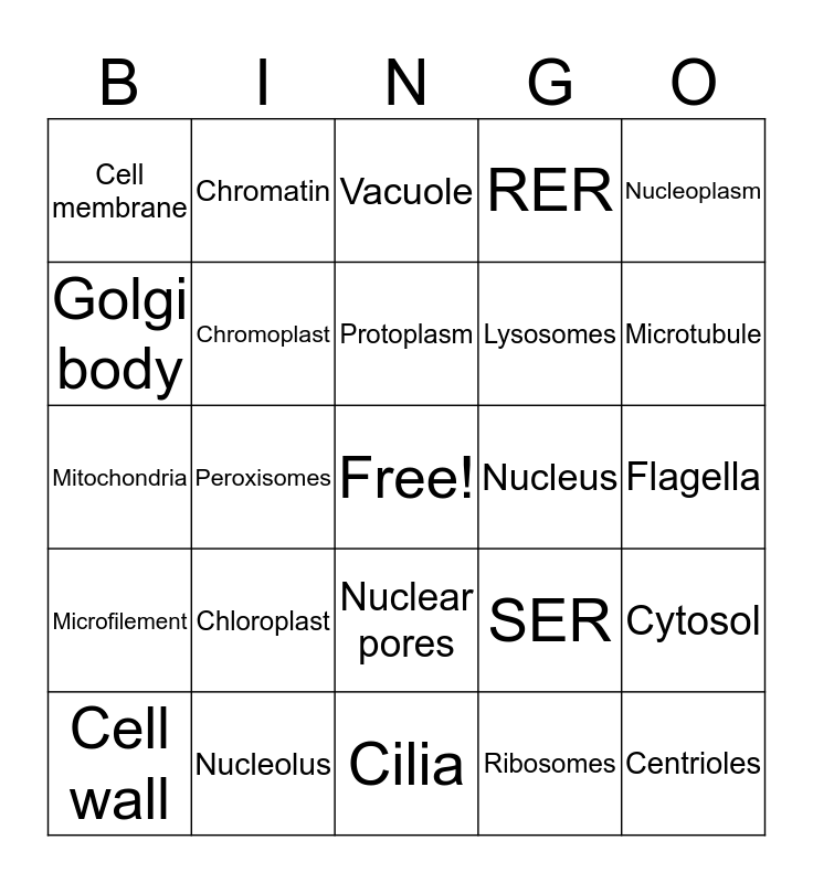 This bingo card has a free space and 24 words: Chloroplast, Nucleolus, Protoplasm, Cell wall, Nucleoplasm, Cell membrane, Golgi body, Chromatin, Nucleus, Nuclear pores, Lysosomes, Mitochondria, SER, Cytosol, Chromoplast, Ribosomes, Flagella, Vacuole, Microtubule, Peroxisomes, Centrioles, Microfilement, RER and Cilia.