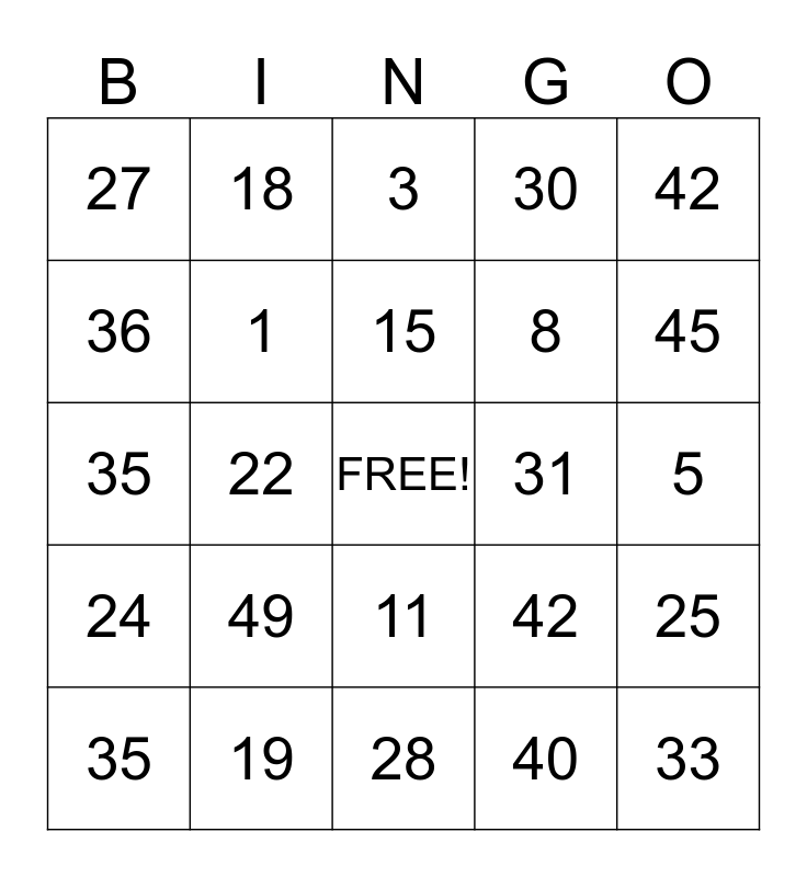 This bingo card has a free space and 24 words: 49, 19, 15, 35, 42, 27, 36, 18, 31, 11, 8, 35, 42, 25, 1, 40, 5, 3, 45, 22, 33, 24, 30 and 28.