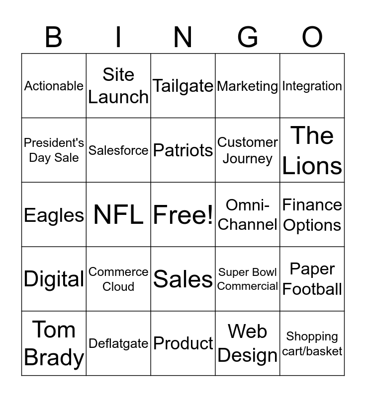 This bingo card has a free space and 24 words: Commerce Cloud, Deflatgate, Patriots, Tom Brady, Integration, Actionable, President's Day Sale, Site Launch, Omni-Channel, Sales, Customer Journey, Eagles, Super Bowl Commercial, Paper Football, Salesforce, Web Design, Finance Options, Tailgate, The Lions, NFL, Shopping cart/basket, Digital, Marketing and Product.