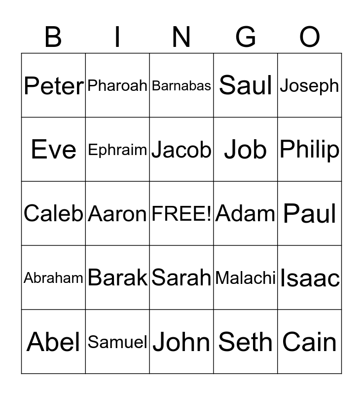 This bingo card has a free space and 24 words: Abel, Barak, Jacob, Seth, Joseph, Peter, Pharoah, Barnabas, Adam, Paul, Caleb, Ephraim, Malachi, Isaac, Eve, Samuel, John, Saul, Philip, Abraham, Aaron, Sarah, Job and Cain.