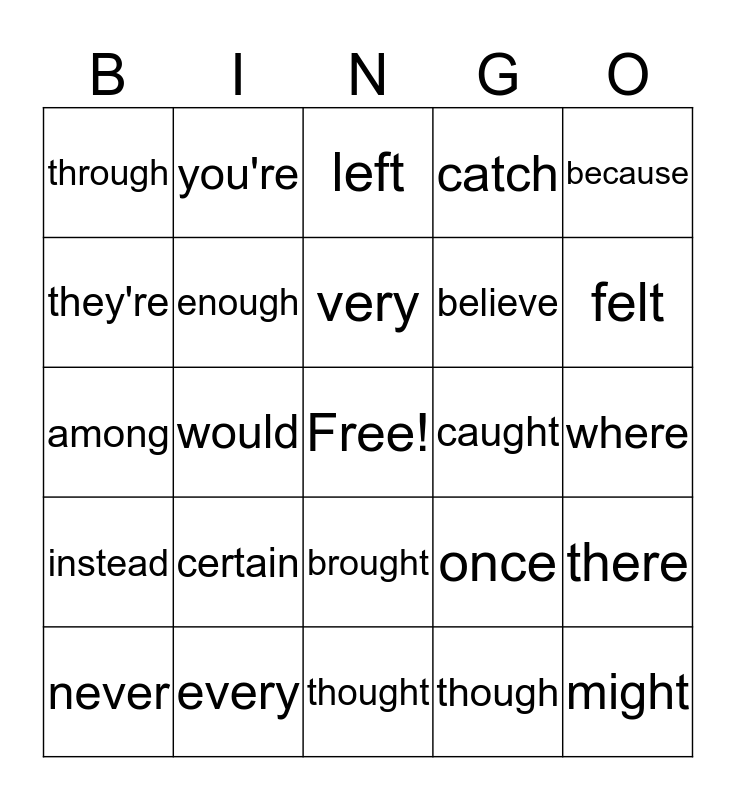 This bingo card has a free space and 24 words: certain, every, very, never, because, through, they're, you're, caught, brought, believe, among, once, there, enough, though, where, left, felt, would, might, instead, catch and thought.