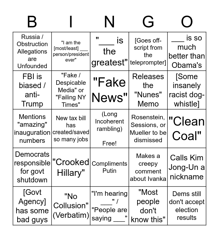 This bingo card has a free space and 24 words: "Crooked Hillary", "No Collusion" (Verbatim), "Fake News", [Govt Agency] has some bad guys, ___ is so much better than Obama's, Russia / Obstruction Allegations are Unfounded, FBI is biased / anti-Trump, "I am the [most/least] ___ person/president ever", Rosenstein, Sessions, or Mueller to be dismissed, Compliments Putin, Releases the "Nunes" Memo, Mentions "amazing" inauguration numbers, Makes a creepy comment about Ivanka, Calls Kim Jong-Un a nickname, "Fake / Despicable Media" or "Failing NY Times", "Most people don't know this", "Clean Coal", "___ is the greatest", [Some insanely racist dog-whistle], New tax bill has created/saved so many jobs, Dems still don't accept election results, Democrats responsible for govt shutdown, [Goes off-script from the teleprompter] and "I'm hearing ___" / "People are saying ___".
