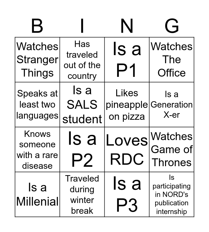 This bingo card has 16 words: Traveled during winter break, Watches Game of Thrones, Is a P1, Watches Stranger Things, Knows someone with a rare disease, Has traveled out of the country, Loves RDC, Is a P3, Speaks at least two languages, Is a SALS student, Is a Millenial, Watches The Office, Is a P2, Is a Generation X-er, Likes pineapple on pizza and Is participating in NORD's publication internship.