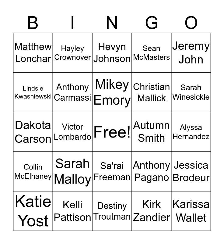 This bingo card has a free space and 63 words: Daniel Adams, Madison Ainsworth, Steven Ash, Jessica Brodeur, Rachel Brosky, Michael Connor, Hayley Crownover, Chris DeSanti, Mikey Emory, Kylie Foster, Sa'rai Freeman, Laura Gillette, Alyssa Hernandez, Jeremy John, Courtney Kupniewski, Lindsie Kwasniewski, Victor Lombardo, Matthew Lonchar, Hannah Madden, Christian Mallick, Sarah Malloy, Collin McElhaney, Sean McMasters, Aimee Medvedik, Savannah Merrill, Danielle Newberry, Brandon Phillippi, Brent Platt, Gaby Reyer, Allie Rose, Stephanie Sarver, Shane Schlak, Klohie Sourbeer, Michael Thomas, Sarah Winesickle, Katie Yost, Megan Yost, Kirk Zandier, Alexis Zmijowski, Anthony Carmassi, Dakota Carson, Autumn Smith, Caitlyn Szakal, Cameron Kruisselbrink, Karissa Wallet, Kelli Pattison, Dimera Little, Anthony Pagano, Natalie Liscio, Lindsay Yuska, Kirsten Hegburg, Destiny Troutman, Guilherme Verardo, Kelly Capestrani, Erin Daubner, Hevyn Johnson, Justina Colestock, Hillary Sillaman, Taylor Petro, Jenna Plutyk, Dawa Rawat, Jacob Windsheimer and Natalie Jasko.