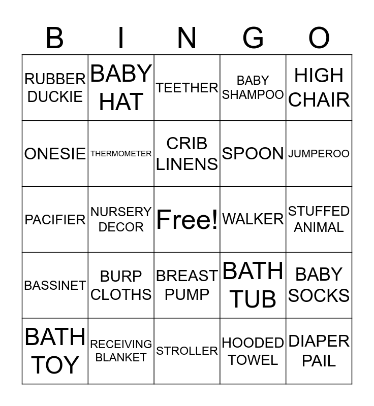 This bingo card has a free space and 49 words: BOTTLE WARMER, BURP CLOTHS, PARENTING BOOK, CAR SEAT, BABY SOCKS, BABY SHOES, BABY HAT, BABY LOTION, BABY SHAMPOO, DIAPER BAG, ONESIE, THERMOMETER, STROLLER, HOODED TOWEL, SIPPY CUP, BATH TOY, NURSERY DECOR, CRIB LINENS, GIFT CARD, HIGH CHAIR, BASSINET, BABY MONITOR, TEETHER, SPOON, RATTLE, PACIFIER, RECEIVING BLANKET, NIGHT LIGHT, BATH TUB, STUFFED ANIMAL, RASH CREAM, SWING, BOUNCER, BLANKET, DIAPER PAIL, DIAPERS, CHANGING PAD, NURSING PILLOW, WALKER, BABY CARRIER, NIGHT LIGHT, ACTIVITY MAT, BREAST PUMP, BURP CLOTH, JUMPEROO, RUBBER DUCKIE, FORMULA, SOMETHING CROCHETED and BABY POWDER.