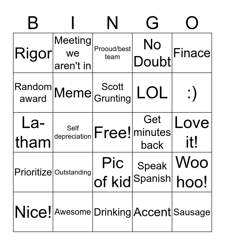 This bingo card has a free space and 24 words: Outstanding, Awesome, Scott Grunting, Nice!, Finace, Rigor, Random award, Meeting we aren't in, Get minutes back, Pic of kid, LOL, La-tham, Speak Spanish, Woo hoo!, Meme, Accent, Love it!, Prooud/best team, :), Self depreciation, Sausage, Prioritize, No Doubt and Drinking.