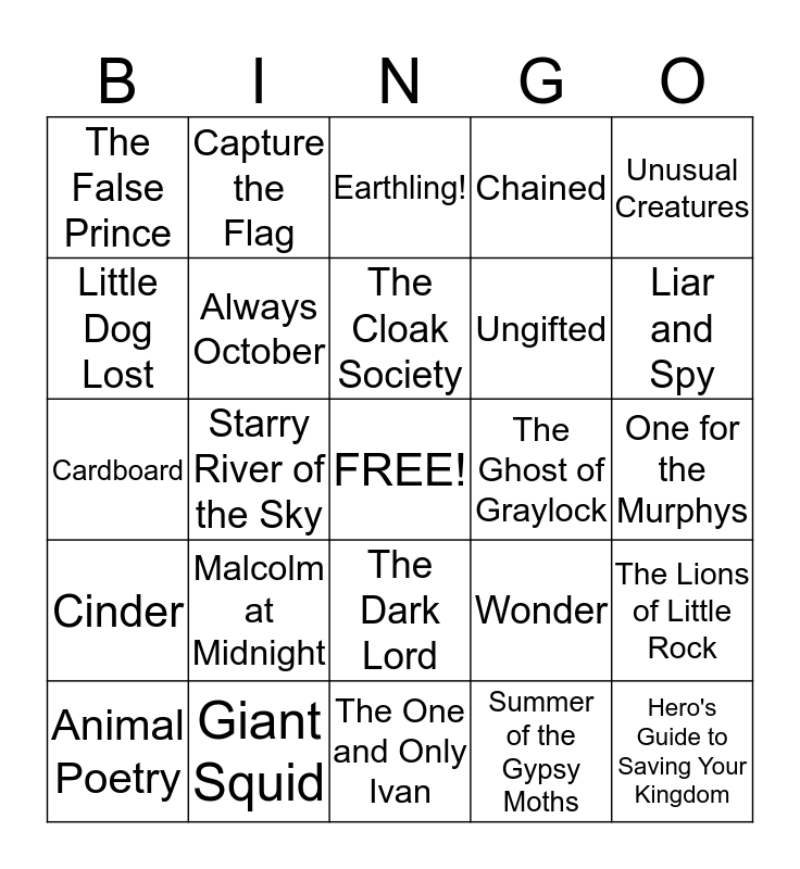This bingo card has a free space and 24 words: Malcolm at Midnight, Giant Squid, The Cloak Society, Animal Poetry, Unusual Creatures, The False Prince, Little Dog Lost, Capture the Flag, The Ghost of Graylock, The Dark Lord, Ungifted, Cardboard, Wonder, The Lions of Little Rock, Always October, Summer of the Gypsy Moths, One for the Murphys, Earthling!, Liar and Spy, Starry River of the Sky, Hero's Guide to Saving Your Kingdom, Cinder, Chained and The One and Only Ivan.