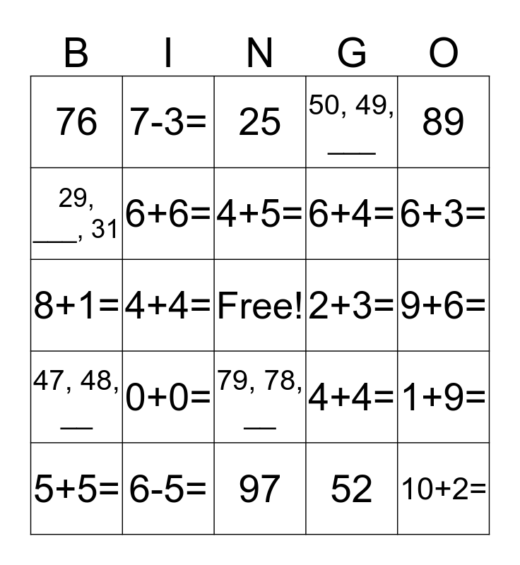 This bingo card has a free space and 24 words: 0+0=, 6-5=, 4+5=, 5+5=, 89, 76, 29, ___, 31, 7-3=, 2+3=, 79, 78, __, 6+4=, 8+1=, 4+4=, 1+9=, 6+6=, 52, 9+6=, 25, 6+3=, 4+4=, 10+2=, 47, 48, __, 50, 49, ___ and 97.