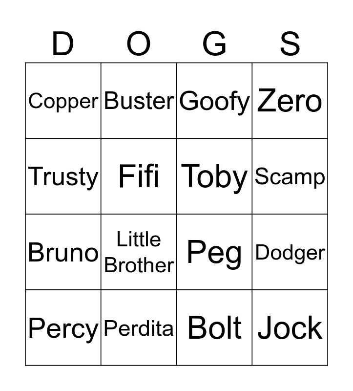 This bingo card has 29 words: Max, Sparky, Dodger, Slinky Dog, Copper, Goofy, Toby, Pongo, Perdita, Thunderbolt, Bolt, Percy, Nana, Stella, Little Brother, Lady, Tramp, Jock, Trusty, Peg, Tito, Georgette, Bruno, Fifi, Zero, Buster, Doug, Scamp and Angel.