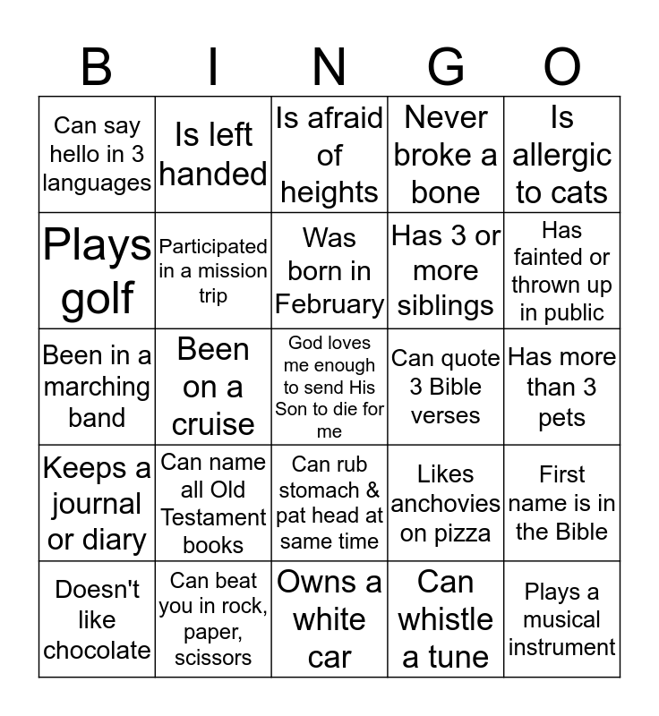 This bingo card has a free space and 24 words: Doesn't like chocolate, Can name all Old Testament books, Was born in February, Can whistle a tune, Is allergic to cats, Can say hello in 3 languages, Is left handed, Is afraid of heights, Can quote 3 Bible verses, Has more than 3 pets, Been in a marching band, Participated in a mission trip, Likes anchovies on pizza, First name is in the Bible, Plays golf, Can beat you in rock, paper, scissors, Owns a white car, Never broke a bone, Has fainted or thrown up in public, Keeps a journal or diary, Been on a cruise, Can rub stomach & pat head at same time, Has 3 or more siblings and Plays a musical instrument.