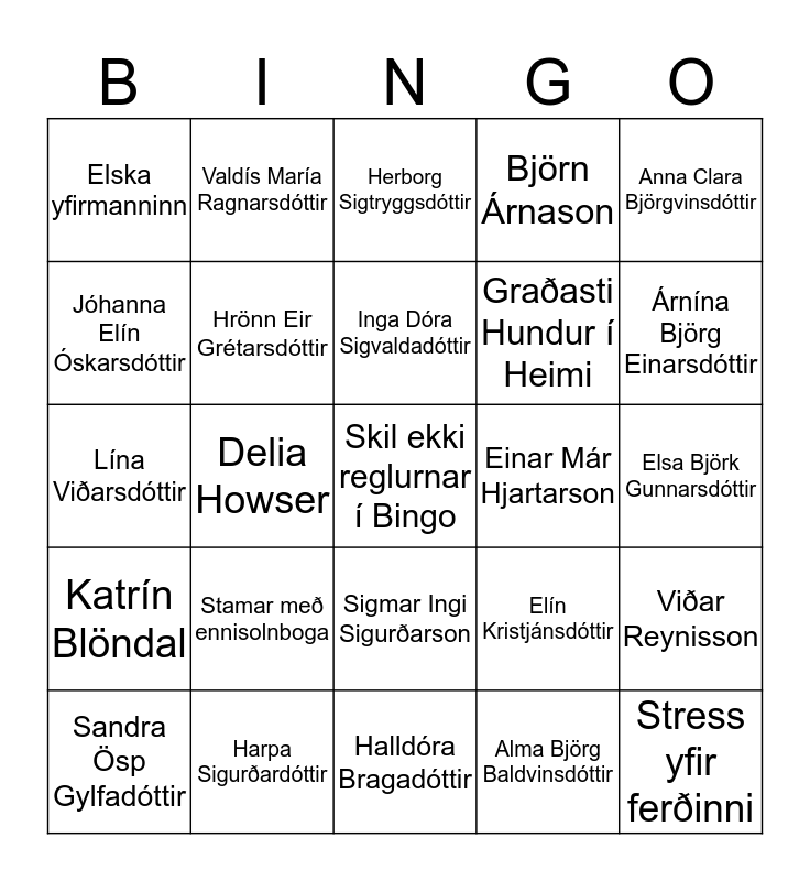 This bingo card has 25 words: Stamar með ennisolnboga, Halldóra Bragadóttir, Inga Dóra Sigvaldadóttir, Sandra Ösp Gylfadóttir, Anna Clara Björgvinsdóttir, Elska yfirmanninn, Jóhanna Elín Óskarsdóttir, Valdís María Ragnarsdóttir, Einar Már Hjartarson, Sigmar Ingi Sigurðarson, Graðasti Hundur í Heimi, Lína Viðarsdóttir, Elín Kristjánsdóttir, Viðar Reynisson, Hrönn Eir Grétarsdóttir, Stress yfir ferðinni, Elsa Björk Gunnarsdóttir, Herborg Sigtryggsdóttir, Árnína Björg Einarsdóttir, Delia Howser, Skil ekki reglurnar í Bingo, Harpa Sigurðardóttir, Katrín Blöndal, Björn Árnason and Alma Björg Baldvinsdóttir.