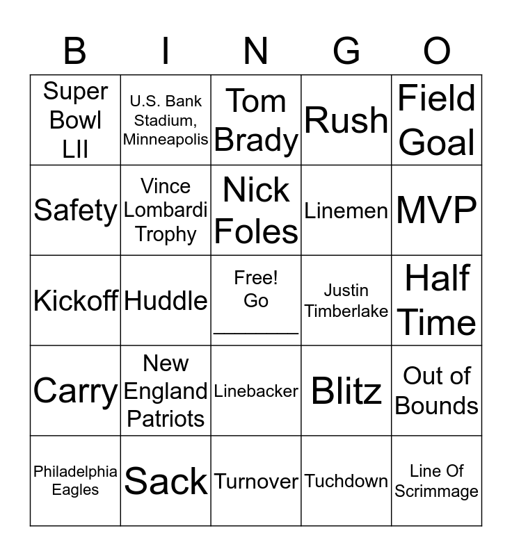 This bingo card has a free space and 24 words: Philadelphia Eagles, New England Patriots, Nick Foles, Tuchdown, Field Goal, Super Bowl LII, U.S. Bank Stadium, Minneapolis, Tom Brady, Justin Timberlake, Half Time, Kickoff, Vince Lombardi Trophy, Blitz, Out of Bounds, Safety, Sack, Turnover, Rush, MVP, Carry, Huddle, Linebacker, Linemen and Line Of Scrimmage.