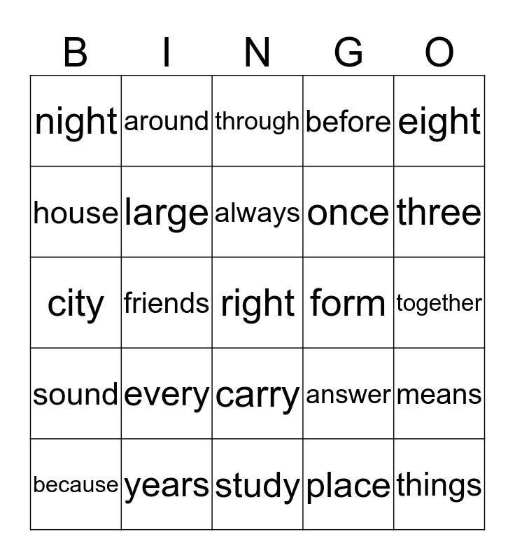 This bingo card has 25 words: sound, years, right, place, eight, night, around, through, form, means, house, large, study, answer, three, because, friends, always, once, together, city, every, carry, before and things.