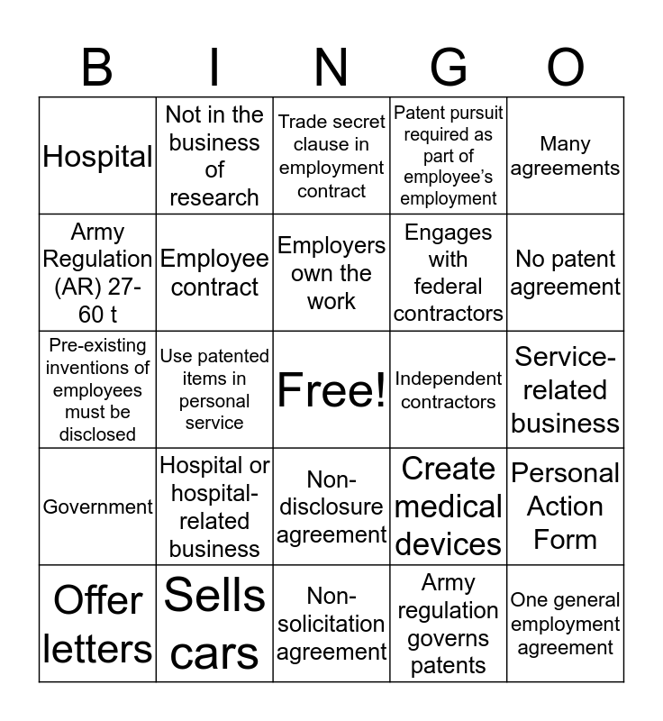 This bingo card has a free space and 61 words: Medical device, Sells cars, Makes and sells something, Government, Army regulation governs patents, Use government funds for patents, Employee contract, Protect trade secrets, Engages with federal contractors, Employees assign patents to employer, Patent pursuit required as part of employee’s employment, Govnerment compliance requirements, Army Regulation (AR) 27-60 t, Cooperative research and development agreements, Provides homeless services, Hospital, One general employment agreement, Many agreements, Employees own the work, Employers own the work, Independent contractors, Trade secret clause in employment contract, Offer letters, Personal Action Form, Collective Bargaiing Agreement, Confidentiality agreement, Patents pursued, Confidentiality agreemnts include patent clause, No patent agreement, Local government, Employee agreements do not include patent, Community development, Education, Not in the business of pursuing new items, Not in the business of research, Not in the business of incentivizing through patents, Personal service, Use patented items in personal service, Employee agreements include ownership and assignment of patent rights., Pre-existing inventions of employees must be disclosed, Employee disclosure requirement, Hospital or hospital-related business, Service-related business, Individual employees hold patents, Create medical devices, Use medical devices within company or services of the company, Offer letter speaks to ownership and assignment of patent rights., Offer letter does not speak to ownership and assignment of patent rights, Conflict of Interest form for employees, Non-disclosure agreement, Non-solicitation agreement, Employees sign patent-related agreement during onboarding, software, incentives given to employees who submit patentable ideas, Design patents, Utility patents, Language regarding who should be listed as an inventor, Students, Differentiation between employees who invent and those who were hired to invient, Shop right and Patents with national security implicationsa.