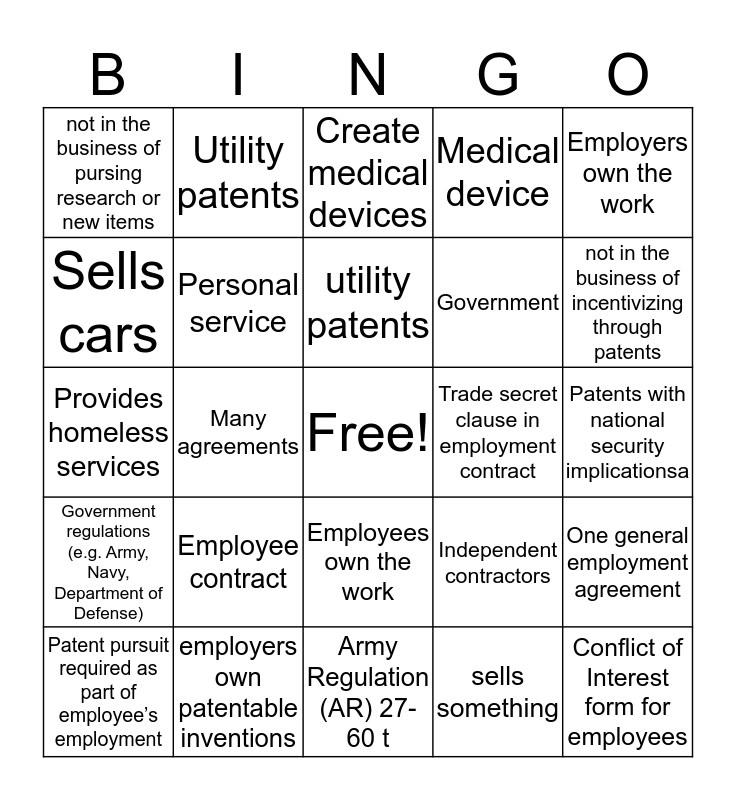 This bingo card has a free space and 95 words: medical, makes something, sells something, services, uses government funds for patent research, government, employees own patentable inventions, employers own patentable inventions, independent contractors, trade secret clause in employment agreement, steps taken to keep trade secrets secret, no patents, employee monetary incentive to create patentable inventions, utility patents, design patents, not in the business of pursing research or new items, not in the business of incentivizing through patents, employee agreements including ownership and assignment of patent rights to employer, pre-existing inventions of employes must be disclosed, NDA, students, shop right, patents with national security implications, unusual patents, Medical device, Sells cars, Makes and sells something, Government, Army regulation governs patents, Use government funds for patents, Employee contract, Protect trade secrets, Engages with federal contractors, Employees assign patents to employer, Patent pursuit required as part of employee’s employment, Govnerment compliance requirements, Army Regulation (AR) 27-60 t, Cooperative research and development agreements, Provides homeless services, Hospital, One general employment agreement, Many agreements, Employees own the work, Employers own the work, Independent contractors, Trade secret clause in employment contract, Offer letters, Personal Action Form, Collective Bargaiing Agreement, Confidentiality agreement, Patents pursued, Confidentiality agreemnts include patent clause, No patent agreement, Local government, Employee agreements do not include patent, Community development, Education, Not in the business of pursuing new items, Not in the business of research, Not in the business of incentivizing through patents, Personal service, Use patented items in personal service, Employee agreements include ownership and assignment of patent rights., Pre-existing inventions of employees must be disclosed, Employee disclosure requirement, Hospital or hospital-related business, Service-related business, Individual employees hold patents, Create medical devices, Use medical devices within company or services of the company, Offer letter speaks to ownership and assignment of patent rights., Offer letter does not speak to ownership and assignment of patent rights, Conflict of Interest form for employees, Non-disclosure agreement, Non-solicitation agreement, Employees sign patent-related agreement during onboarding, software, incentives given to employees who submit patentable ideas, Design patents, Utility patents, Language regarding who should be listed as an inventor, Students, Differentiation between employees who invent and those who were hired to invient, Shop right, Patents with national security implicationsa, Government regulations (e.g. Army, Navy, Department of Defense), education, service, homeless, greeting cards, 5 or less patents, 10 -20 patents, 100-200 patents, 200-500 patents and Over 1000 patents.