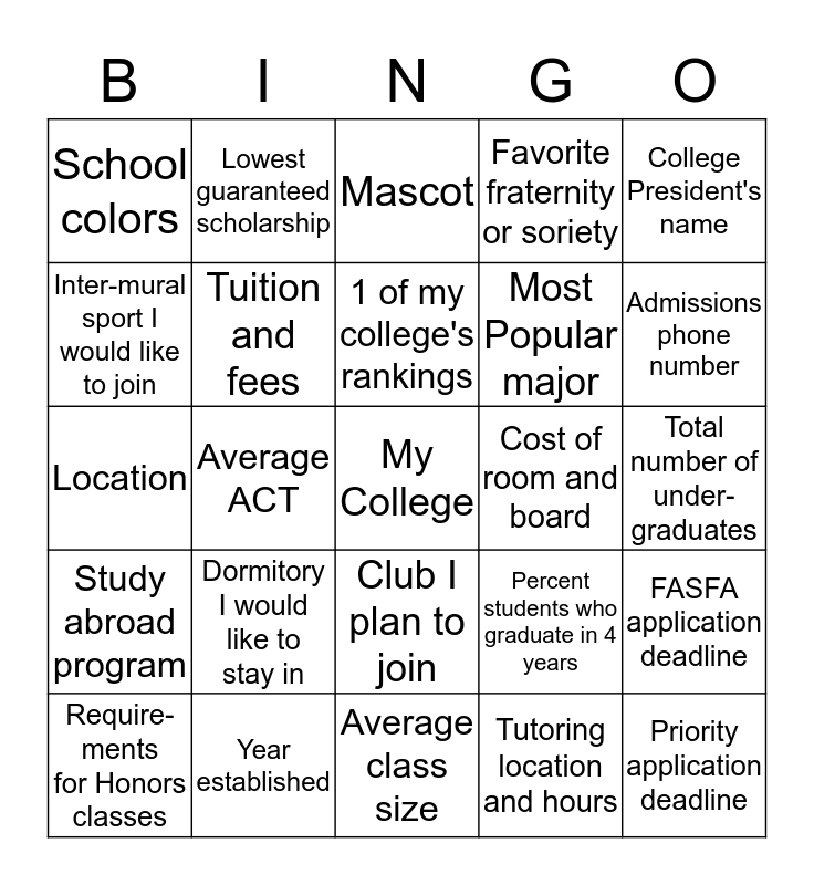This bingo card has a free space and 24 words: Dormitory I would like to stay in, Year established, 1 of my college's rankings, Require-ments for Honors classes, College President's name, School colors, Inter-mural sport I would like to join, Lowest guaranteed scholarship, Cost of room and board, Club I plan to join, Most Popular major, Location, Percent students who graduate in 4 years, FASFA application deadline, Tuition and fees, Tutoring location and hours, Total number of under-graduates, Mascot, Admissions phone number, Average ACT, Priority application deadline, Study abroad program, Favorite fraternity or soriety and Average class size.