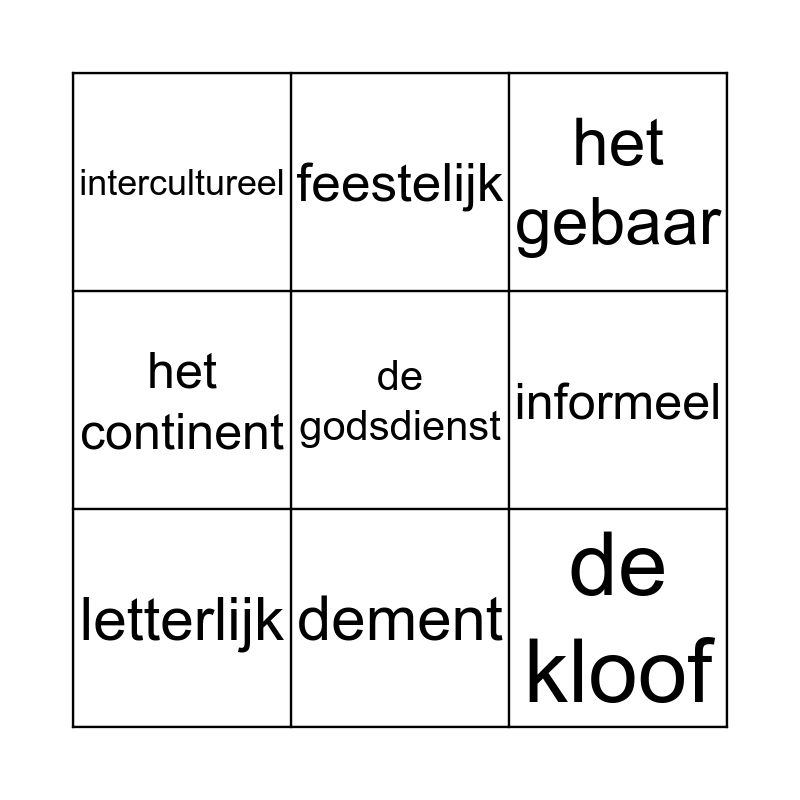 This bingo card has 52 words: arrangement, bespreekbaar, boeken, culinair, het diner, eeuwig, feestelijk, het gezelschap, informeel, intiem, letterlijk, de luchthaven, onvergetelijk, de achtergrond, het bestaan, het complex, dement, dementeren, etnisch, de godsdienst, herkennen, de integratie, intercultureel, de kloof, streven, de woonunit, de wortel, andermans, de autoriteit, bekend zijn met, de belediging, het continent, het contrast, evenals, extreem, het gebaar, ademen, bleek, fysiek, geneesmiddel, herstel, koorts, ongerust, rustig aan doen, symptoom, tekort, vitamine, voeding, weerstand, aantonen, bewonderen and confronteren.