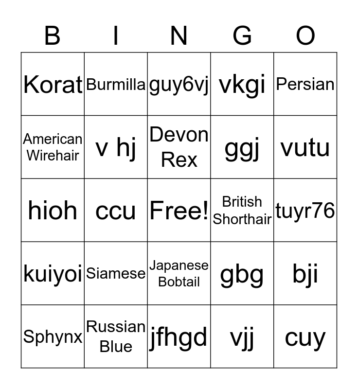 This bingo card has a free space and 24 words: Siamese, Russian Blue, Devon Rex, Sphynx, Persian, Korat, American Wirehair, Burmilla, British Shorthair, Japanese Bobtail, ggj, hioh, gbg, bji, v hj, vjj, tuyr76, guy6vj, vutu, ccu, cuy, kuiyoi, vkgi and jfhgd.