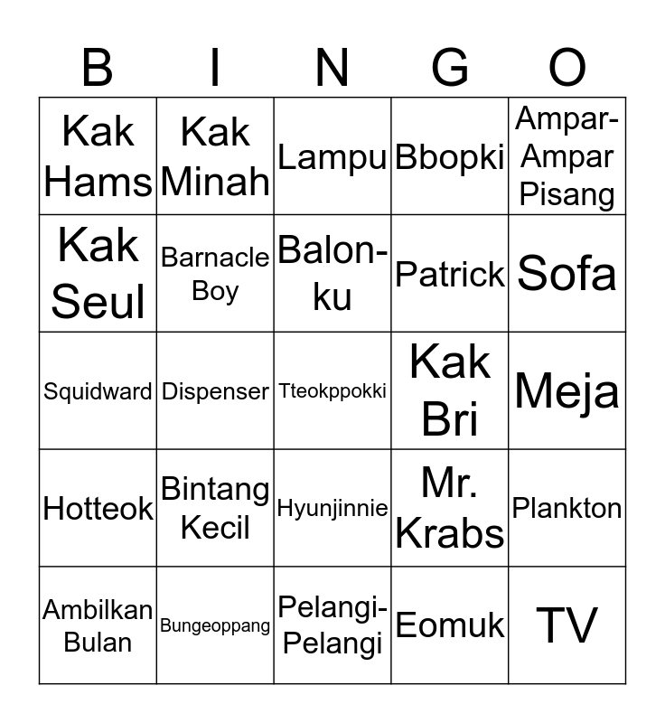 This bingo card has 25 words: Bintang Kecil, Pelangi-Pelangi, Balon-ku, Ambilkan Bulan, Ampar-Ampar Pisang, Kak Hams, Kak Seul, Kak Minah, Kak Bri, Hyunjinnie, Patrick, Squidward, Mr. Krabs, Plankton, Barnacle Boy, TV, Meja, Lampu, Sofa, Dispenser, Tteokppokki, Bungeoppang, Hotteok, Bbopki and Eomuk.