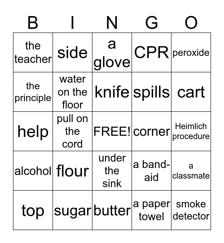 This bingo card has a free space and 24 words: flour, sugar, knife, top, peroxide, the teacher, the principle, side, corner, under the sink, spills, help, a band-aid, a classmate, water on the floor, a paper towel, Heimlich procedure, a glove, cart, pull on the cord, smoke detector, alcohol, CPR and butter.