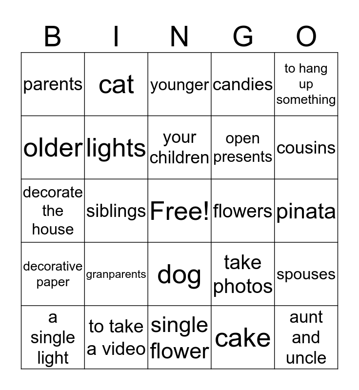 This bingo card has a free space and 24 words: granparents, to take a video, your children, a single light, to hang up something, parents, older, cat, flowers, dog, open presents, decorate the house, take photos, spouses, lights, cake, pinata, younger, cousins, siblings, aunt and uncle, decorative paper, candies and single flower.