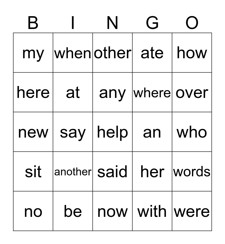 This bingo card has a free space and 24 words: another, be, any, no, how, my, here, when, an, said, where, new, her, words, at, with, who, other, over, say, were, sit, ate and now.