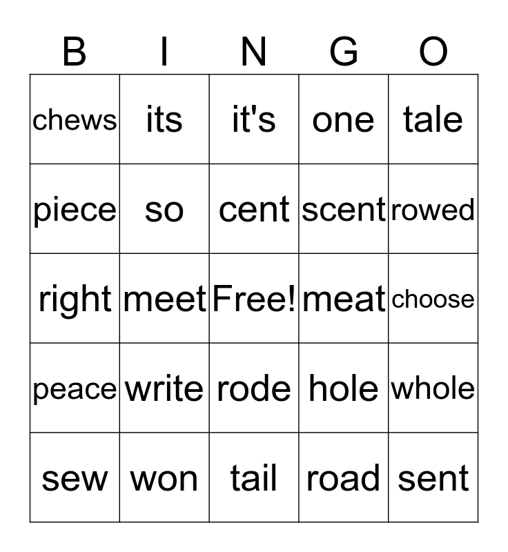 This bingo card has a free space and 24 words: write, won, cent, sew, tale, chews, piece, its, meat, rode, scent, right, hole, whole, so, road, choose, it's, rowed, meet, sent, peace, one and tail.
