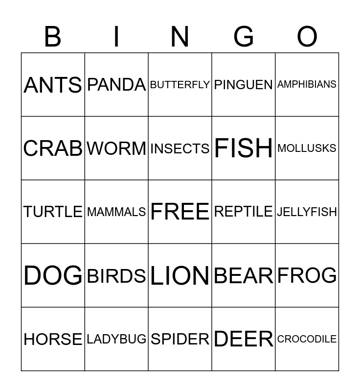 This bingo card has a free space and 24 words: BIRDS, LADYBUG, INSECTS, HORSE, AMPHIBIANS, ANTS, CRAB, PANDA, REPTILE, LION, FISH, TURTLE, BEAR, FROG, WORM, DEER, JELLYFISH, BUTTERFLY, MOLLUSKS, MAMMALS, CROCODILE, DOG, PINGUEN and SPIDER.