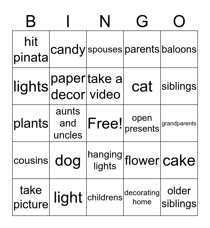 This bingo card has a free space and 24 words: dog, light, take a video, take picture, baloons, hit pinata, lights, candy, open presents, hanging lights, cat, plants, flower, cake, paper decor, decorating home, grandparents, spouses, siblings, aunts and uncles, older siblings, cousins, parents and childrens.