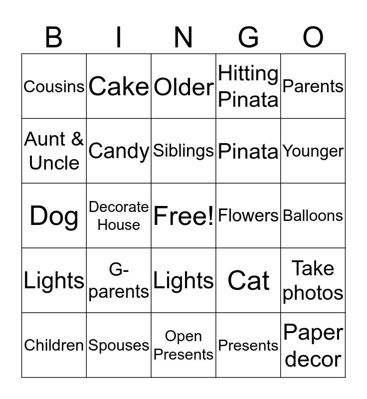 This bingo card has a free space and 24 words: G-parents, Spouses, Siblings, Children, Parents, Cousins, Aunt & Uncle, Cake, Flowers, Lights, Pinata, Dog, Cat, Take photos, Candy, Presents, Balloons, Older, Younger, Decorate House, Paper decor, Lights, Hitting Pinata and Open Presents.