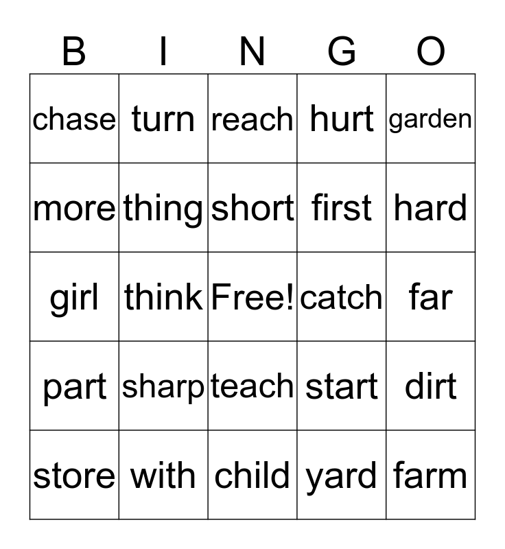 This bingo card has a free space and 30 words: with, such, think, both, chase, reach, thing, teach, catch, child, far, farm, yard, cart, hard, park, start, part, sharp, garden, girl, fort, turn, first, more, hurt, dirt, store, short and burn.