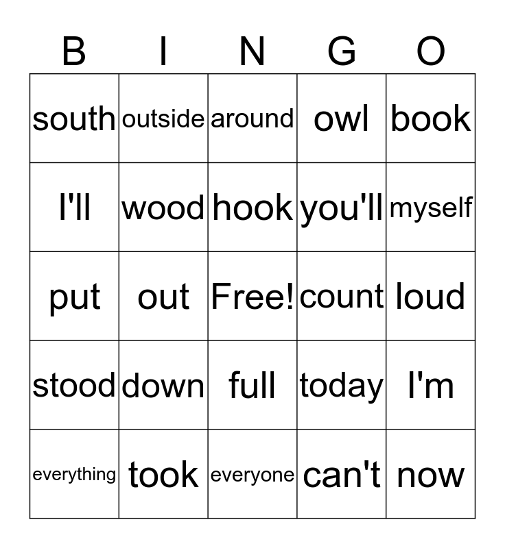 This bingo card has a free space and 40 words: look, put, cook, wood, took, full, hook, good, book, stood, out, owl, now, loud, count, down, sound, south, ground, around, I'm, can't, you'll, I'll, it's, there's, we'll, don't, that's, wouldn't, into, everything, sometimes, today, myself, everyone, weekend, bedroom, outside and nothing.