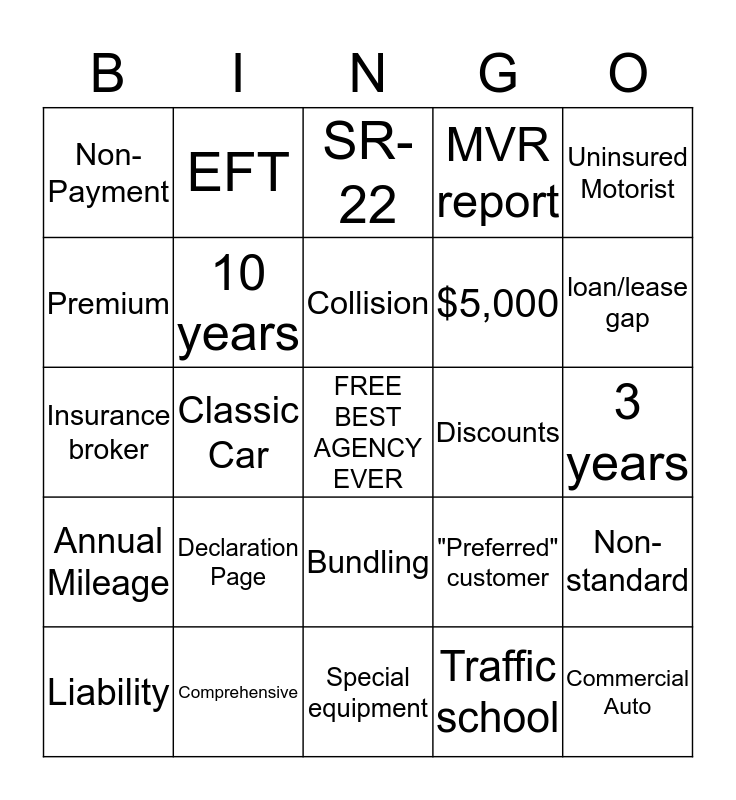 This bingo card has a free space and 24 words: Declaration Page, Comprehensive, Collision, Liability, Uninsured Motorist, Non-Payment, Premium, EFT, Discounts, Bundling, $5,000, Insurance broker, "Preferred" customer, Non-standard, 10 years, Traffic school, 3 years, SR-22, loan/lease gap, Classic Car, Commercial Auto, Annual Mileage, MVR report and Special equipment.