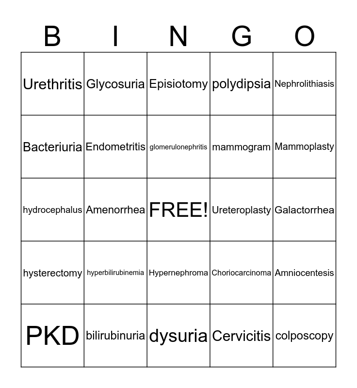 This bingo card has a free space and 24 words: hyperbilirubinemia, bilirubinuria, glomerulonephritis, PKD, Nephrolithiasis, Urethritis, Bacteriuria, Glycosuria, Ureteroplasty, Hypernephroma, mammogram, hydrocephalus, Choriocarcinoma, Amniocentesis, Endometritis, Cervicitis, Galactorrhea, Episiotomy, Mammoplasty, Amenorrhea, colposcopy, hysterectomy, polydipsia and dysuria.