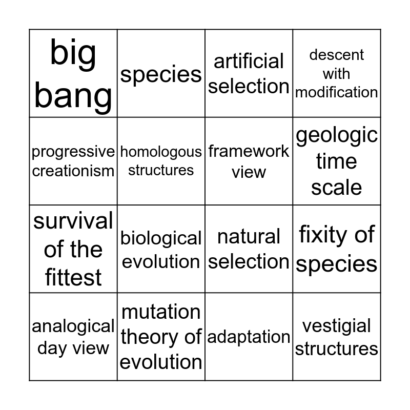 This bingo card has 17 words: adaptation, analogical day view, artificial selection, big bang, biological evolution, descent with modification, fixity of species, framework view, geologic time scale, homologous structures, mutation theory of evolution, natural selection, progressive creationism, species, survival of the fittest, theistic evolution and vestigial structures.